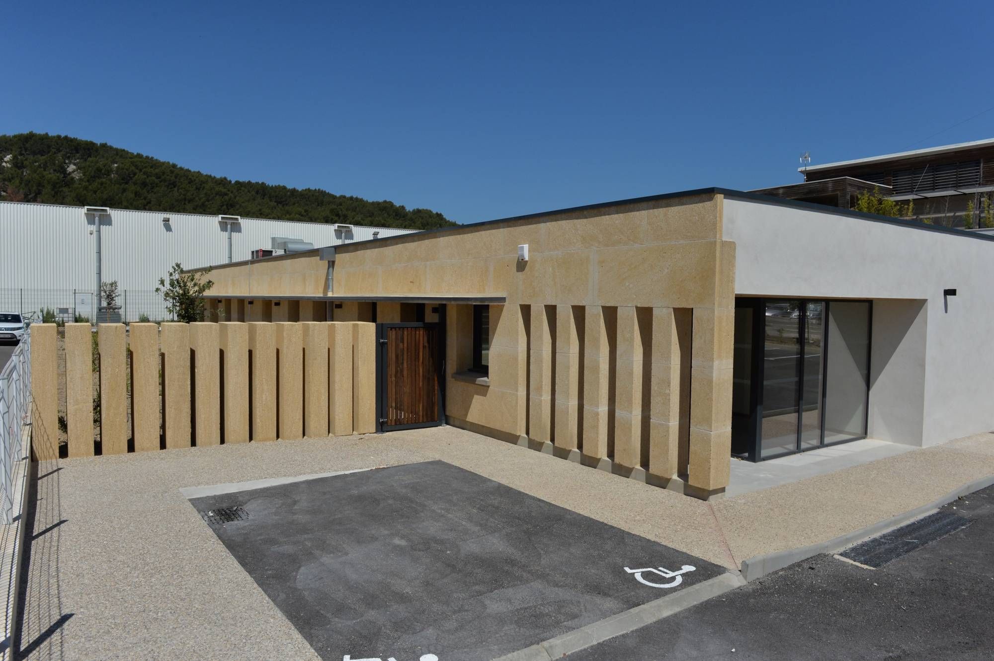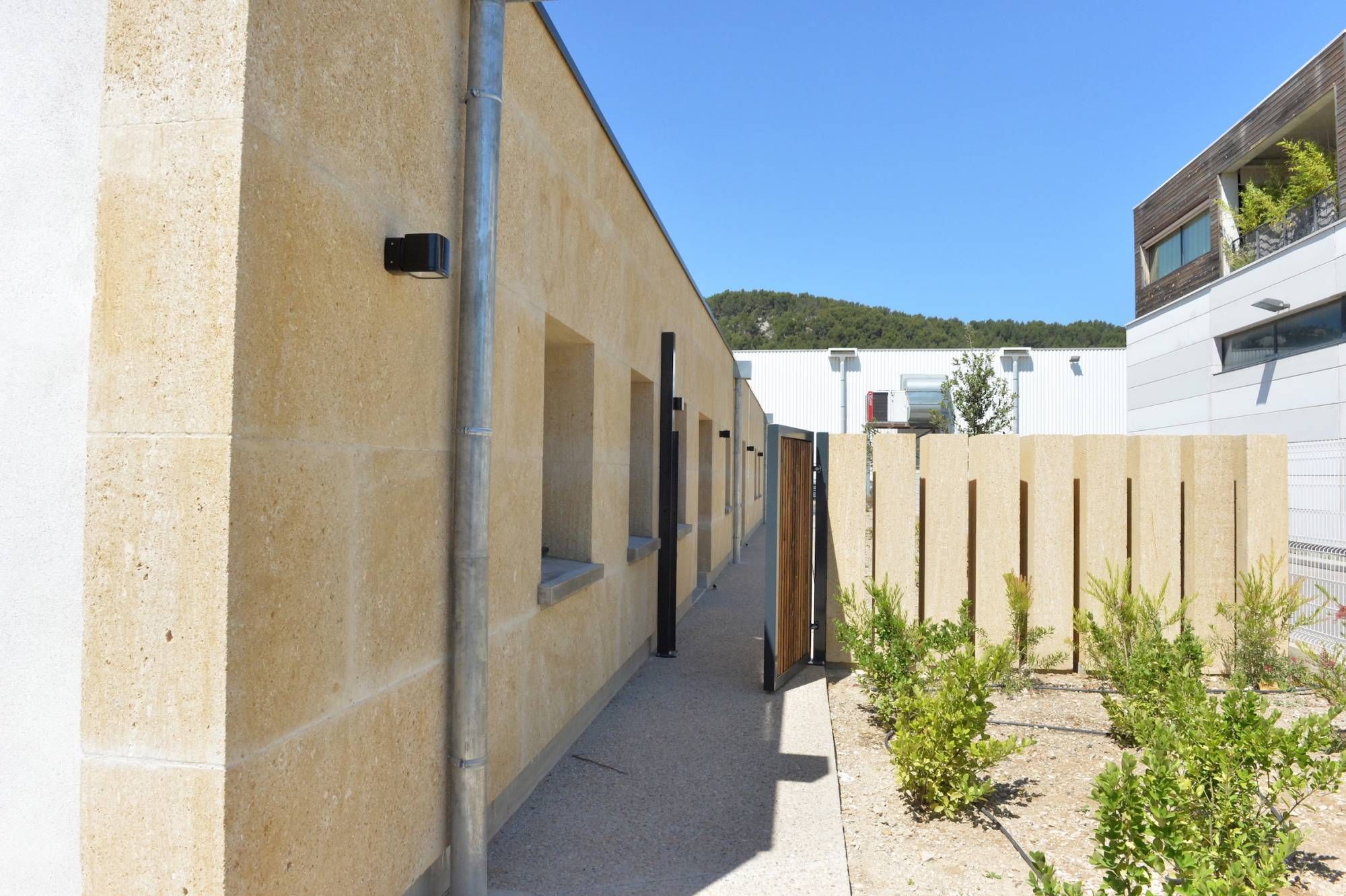 Cette pierre réputée pour son aspect unique coquillé à grain grossier, de couleur dominante ocre, a été mise en valeur par l'architect SCOP Ecostudio.