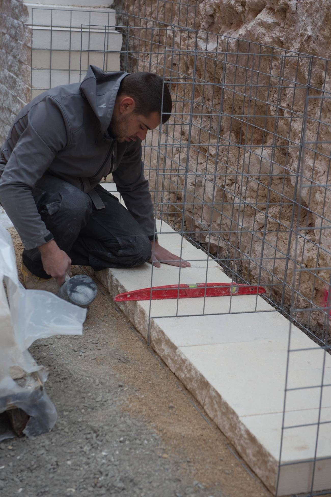 En effet, la pierre est éclatée, de façon à remplir le grillage de notre matériau.