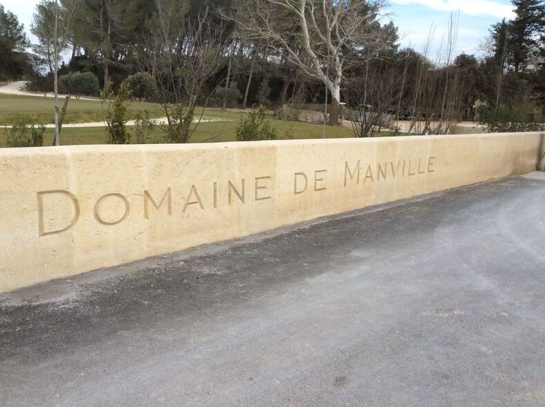 Ce mur permet d'accueillir, dès l'entrée, le client en ayant gravé le nom du domaine directement dans la pierre.